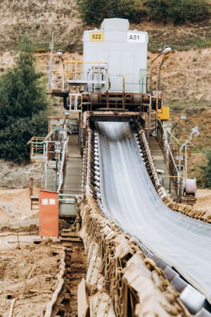 Stone crusher machine on top of open pit mine terraces. Panorama of gravel quarry in Pyrga area, Cyprus
