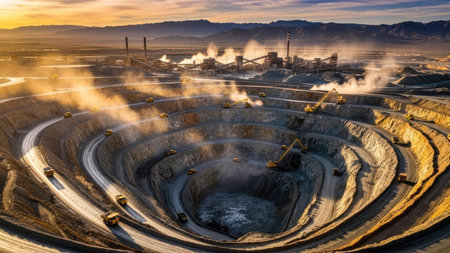 A vast openpit mining site showcases terraced levels, heavy machinery, and workers in a dusty, sunlit landscape, highlighting a significant resource extraction operation