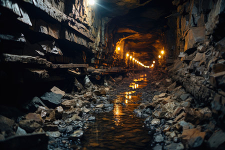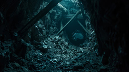 Deep within an abandoned mine, a narrow tunnel reveals the remnants of past labor. Haunting shadows dance on the rocky walls, while the soft glow of light breathes life into this forgotten space.
