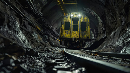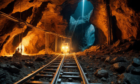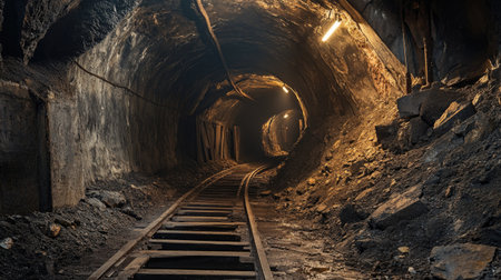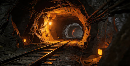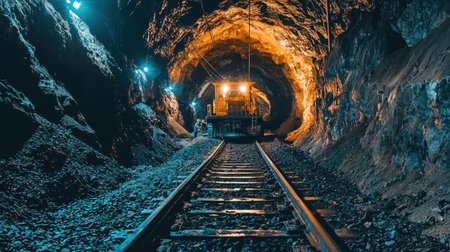 Dark underground mining tunnel with rail tracks illuminated by industrial lights. Mining industry concept