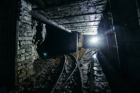 Railway tunnel at night in a dark underground mine. Underground passage in the mine.