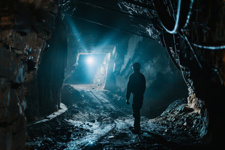 A solitary miner stands silhouetted in a dim underground tunnel, illuminated by soft glowing lights, capturing the essence of exploration.