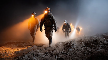 A group of miners dressed in safety gear and equipped with headlamps navigate a dusty terrain at night, showcasing teamwork and determination in their work environment.
