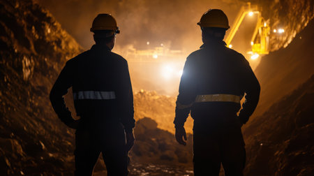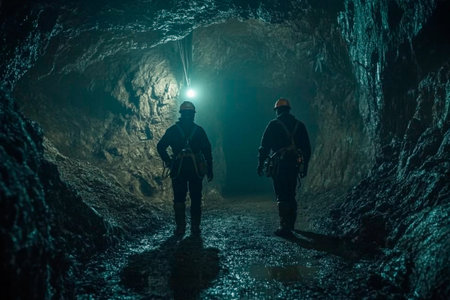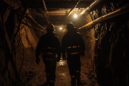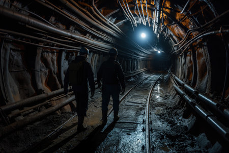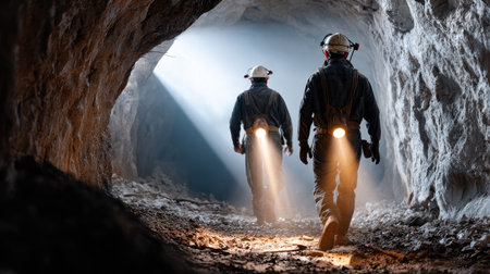 Two miners in helmets and headlamps walk in a dark coal mine tunnel, showcasing teamwork in the industrial setting