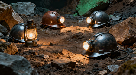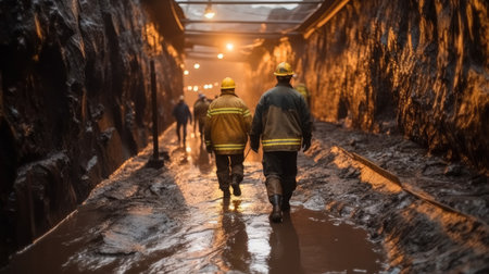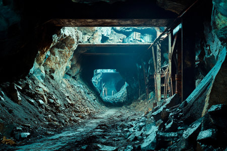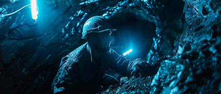 This illustration employs a dramatic and gritty style, ideal for enhancing the visual impact of safety training materials, mining industry publications, or adventure-themed designs. The use of earthy tones and rugged textures adds authenticity to the scene. Perfect for professionals in the mining sector looking for impactful visuals. AI-generated illustration.