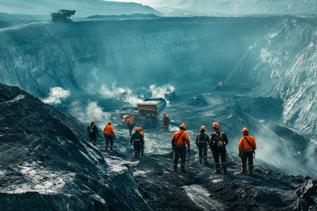 A group of miners in bright orange uniforms work diligently in a large coal mining area.