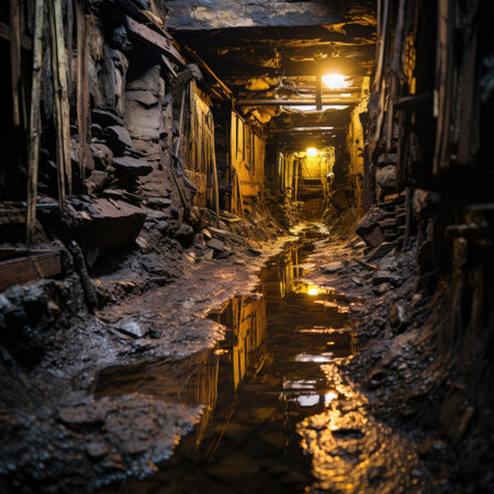 Deep within an abandoned mine, a narrow tunnel reveals the remnants of past labor. Haunting shadows dance on the rocky walls, while the soft glow of light breathes life into this forgotten space.
