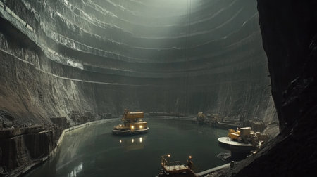 This stunning image depicts a vast underground quarry featuring towering rock walls and clear water reflecting the machinery utilized for excavation.