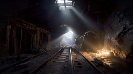 Old abandoned coal mine, generative AI industrial object with rails, dark, illuminated with daylight