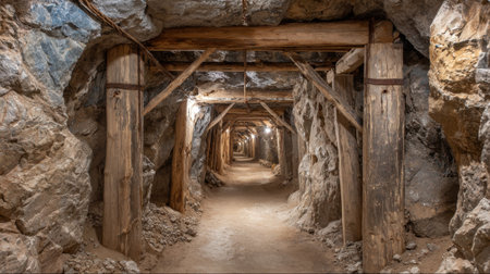 weathered wooden beams supporting mine tunnel, created with generative ai