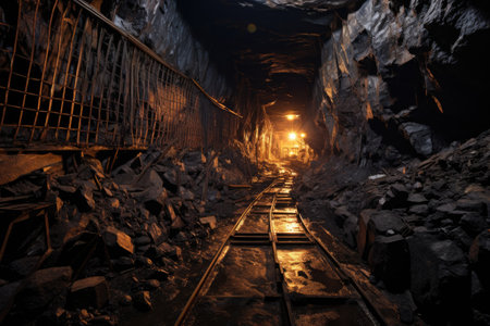 Mine tunnel cave railway. Rock dark mineral. Generate Ai