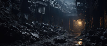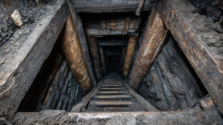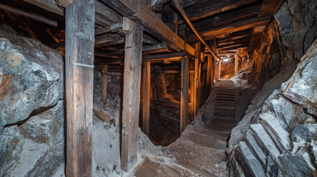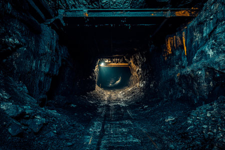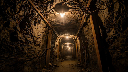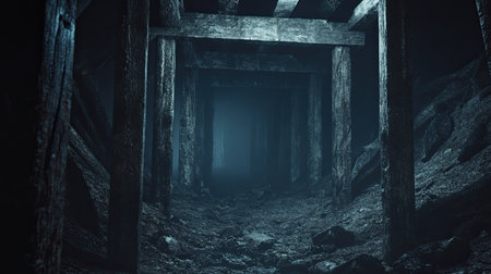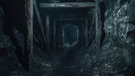 Dark tunnel deep inside an abandoned mine, with rough rock walls and decaying wooden supports, evoking a sense of mystery.