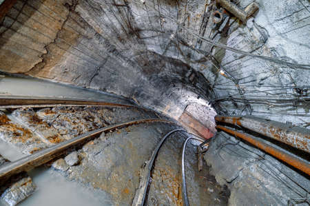 Dark dirty abandoned uranium mine with rusty remnants of railway.