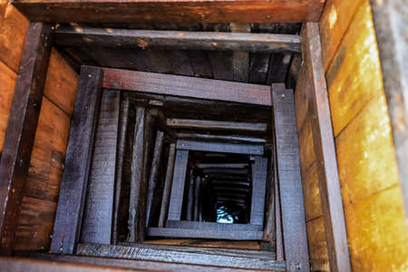 View from inside vertical stone tube downcast shaft with ladder.