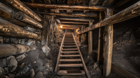 Interior of a mine with a wooden staircase leading to the light, mining gold in space, AI Generated