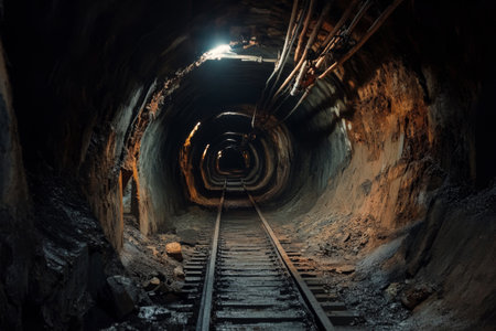 A captivating view of an underground tunnel with train tracks leading into the shadows. Dimly lit by artificial lights, this scene evokes mystery and exploration.