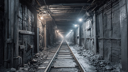 An eerie underground tunnel reveals rusty tracks stretching into the shadowy depths. Dim lights flicker, and the rocky walls exude a sense of history, inviting exploration and imagination.