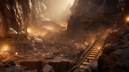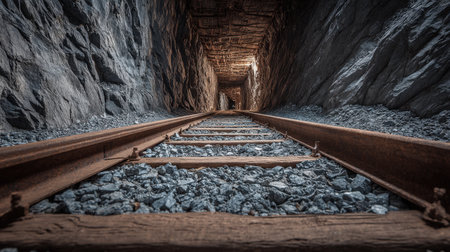 In the dim light of an abandoned mine, shadows play on the rough walls as tracks meander into darkness. The air is filled with a sense of mystery and untold stories from years gone by.