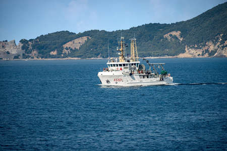 LA SPEZIA, ITALY - JULY 21, 2020: Italian Ship Leonardo A 5301, NATO Coastal Research Vessel (CRV), underwater environmental and acoustic experimentation. Gulf of La Spezia, Liguria, Italy, Europe.