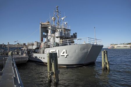Sydney, Australia - October 5, 2013: HMAS Gascoyne (M 85) Huon Class Minehunter Coastal vessel of the Royal Australian Navy in Sydney Harbor.