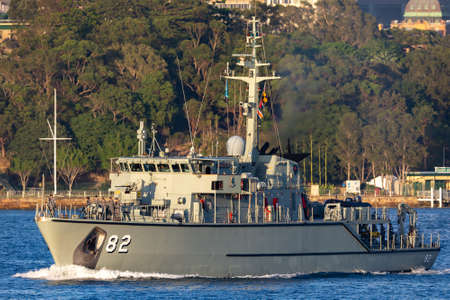 Sydney, Australia - October 5, 2013: HMAS Huon (M 82) Huon Class Minehunter Coastal vessel of the Royal Australian Navy in Sydney Harbor.