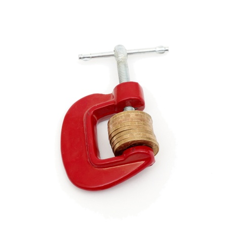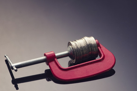 Coins squeezed in a carpenter's clamp. The image of the European currency in crisis. White background.