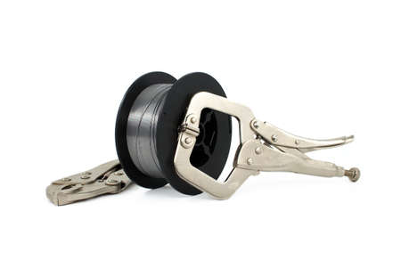 Locking pliers and flux cored welding wire for gasless welding isolated on white background