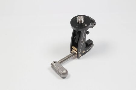 Small black aluminum camera cinema rig screw clamp sitting on a white table with blurred background and copy space.