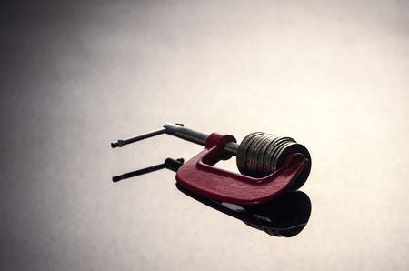 Euro Financial, money, tax pressure concept. Clamp clamping down of a group of euro coins on white background