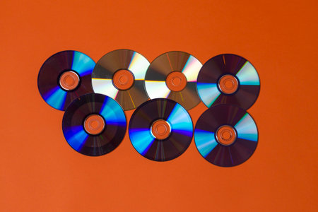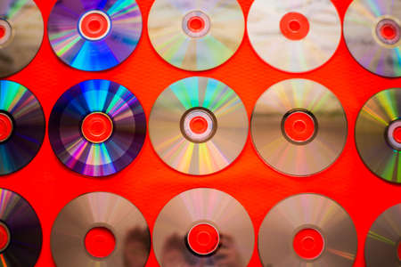 A pile of compact discs on a red background. Focus on the front disc.