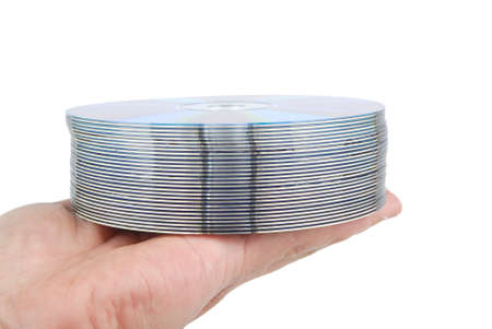 silver cd disk in male hand on white background