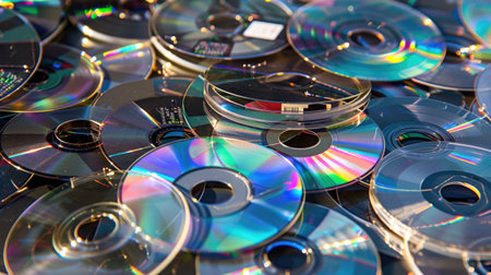 Exploring the intricate textures and reflective surfaces of compact discs in vibrant light