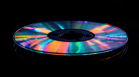 Bright and colorful CD positioned on a black surface with light creating prismatic patterns