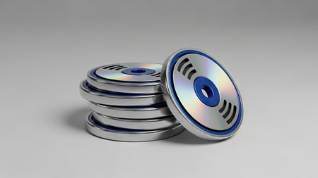 Assortment of shiny compact discs reflecting a spectrum of colors in a pattern, symbolizing data storage AI