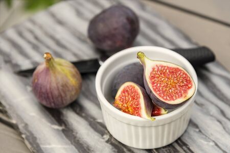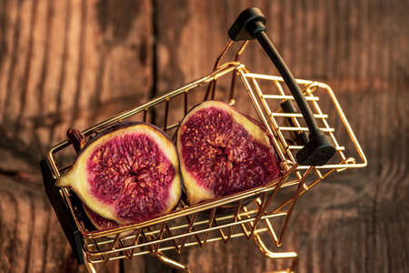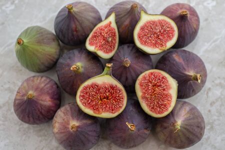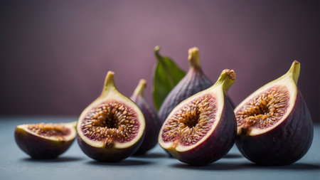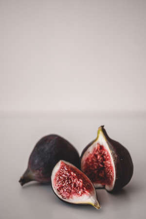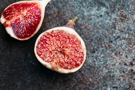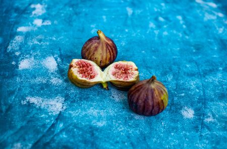 Macro photography of fresh ripe cutted figs on the textured background.