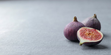 Ripe fresh organic fig fruits with a sliced piece on a gray background with a soft light, simple minimalistic horizontal banner with a copy space