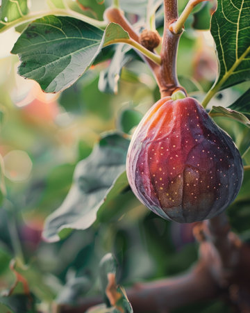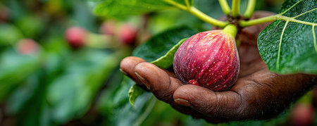 Close-up of hand presenting a ripe fig, highlighting its rich texture and color, set against a backdrop of lush foliage, emphasizing nature's bounty