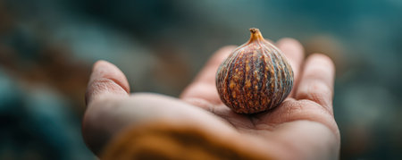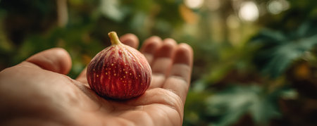 Close-up of hand presenting a fresh fig, highlighting its rich texture and colors, symbolizing health, nature, and organic food choices in a serene environment