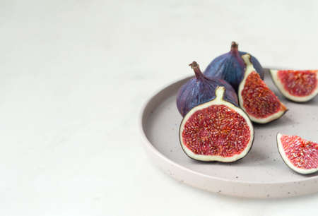 fresh ripe figs whole and cut into slices on stylish beige ceramic plate on gray empty background, selective focus