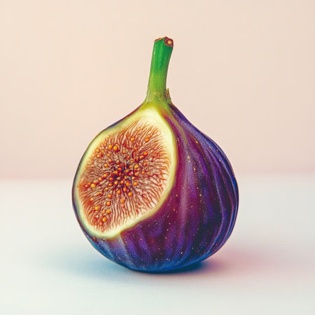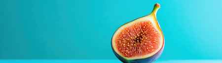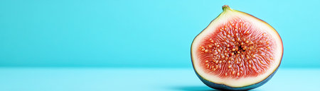 Closeup of a halved fig against a pastel blue background, soft lighting, minimalistic shot