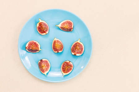Group of cut figs on a blue background Copy space. Flat lay.