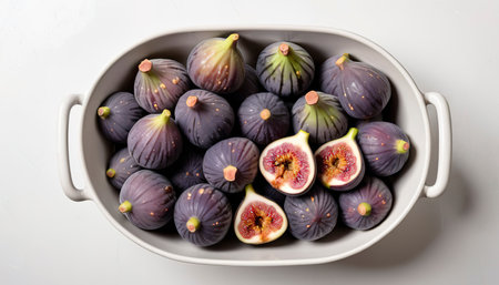 Whole figs and sliced figs in ceramic bowl.