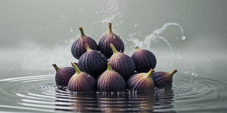 AI Generated. A bunch of figs falling into the water with splashes of water