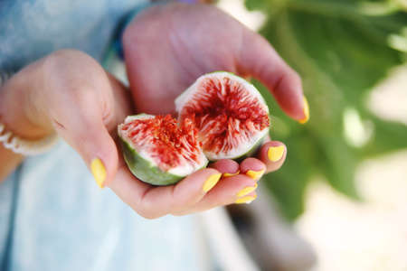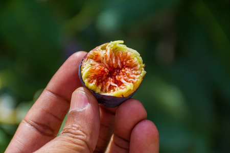 Figs in hand on sky background. Farmer checking the quality of ripe fruit, its color and quality. fruit edible with purplish red skin and soft, sweet flesh with many seeds. Horticultural Spanish.