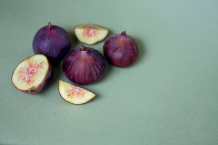 Ripe sweet whole and sliced figs on a green background. Healthy mediterranean fig fruit.