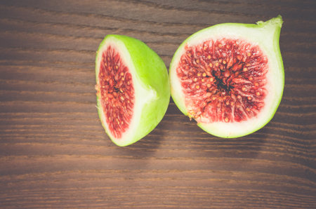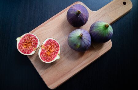 Bright ripe figs on the wooden surface at the back of a dark background. High quality photo