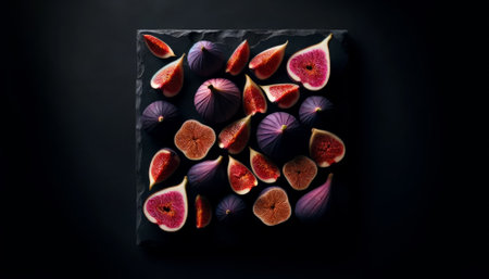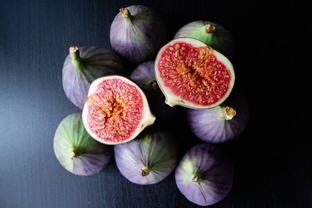 Top view of ripe figs, whole and sliced, artistically arranged on a dark surface
