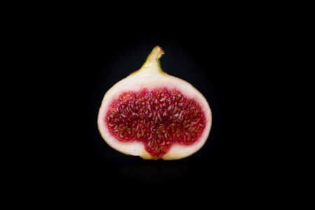 Top view of two halves of Azerbaijani fig fruit. Exotic eastern fruit. Segmented berry isolated on black stone background