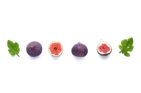 Fresh ripe figs and leaves on white background