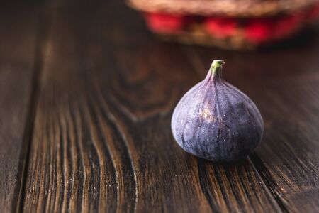 One ripe fig on the wooden table, delicious fruit.